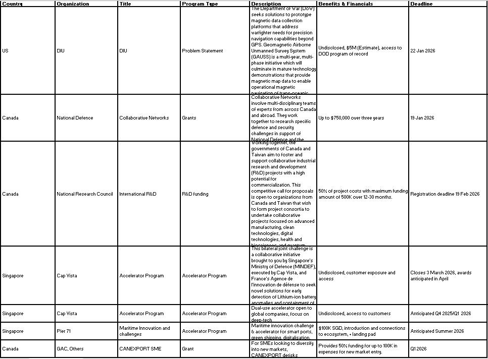 In talking with a few clients and friends, I’ve decided to start a tracker for procurements, grants and funding opportunities and other initiatives that are 1. Export relevant 2. Linked to dual-use tech or deeptech/innovation. Here’s a start: